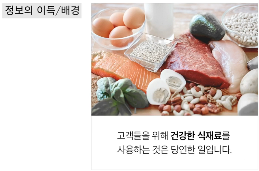 ex) 가게 사장님들이 읽으면 좋은 책을 소개할 때, 앞부분에 책의 주인공이 겪은 상황을 1인칭으로 서술하여 궁금함을 극대화